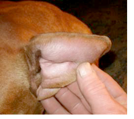 耳介がぶくれて腫れ上がり、手で触れるとやや熱をおびています。また、軽い痛みをともなうことも少なくないので、耳を触られるのをイヤがります。