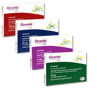 大手製薬会社ファイザー社が製造し、米国食品医薬品局の承認を受けた安全な薬です。セレニアは速やかに吸収され、投与後1時間、1日1回の投与で高い有効性が確認されています。嘔吐の原因治療をしている場合、食欲がない場合にも投薬の負担が少なくてすみ、急性嘔吐の抑制および予防、乗り物酔いによる嘔吐の予防に効果を発揮します。胃腸疾患、腎機能障害、膵臓疾患(膵炎)、肝臓疾患(肝機能障害)による嘔吐や抗ガン剤の副作用による嘔吐、その他(代謝性疾患、糖尿病、脳疾患、薬剤による副作用など)に。体重1kg当たり2mgを1日1回、最大5日間まで経口投与します。乗り物酔いの場合は1時間前までに投与します。
