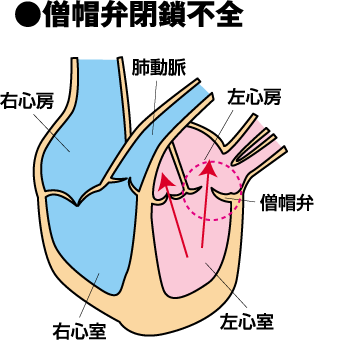 2枚の弁で形成されている僧帽弁が長い時間をかけて少しずつ厚く変形し、よく閉まらなくなる閉鎖不全を起こします。完全に閉じなくなると左心室が血液を押し出そうと圧力をかけた時に、大動脈に流れるはずの血液が左心房に押し戻されたり、肺動脈への影響も出て肺にまで負担をかける病気です。